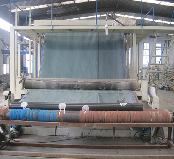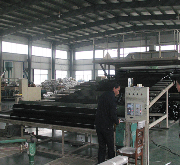 EVA防水板的生產(chǎn)工藝采用先進(jìn)的兩段共擠單摞桿擠出法生產(chǎn), 由原料樹脂EVA加入增強(qiáng)劑、抗氧劑,經(jīng)加熱熔融、塑化、擠出成形、牽引后形 成的板材,也可與穿好吊帶的土工織物(信號(hào)層)熱合成一體,形成復(fù)合防水板, 也可采用擠出壓延法,即將樹脂擠出機(jī)熔融塑化,從機(jī)頭狹縫??跀D出熔融狀的 片坯與吊帶融合一體,經(jīng)輥筒壓延冷卻成光膜,或與穿好吊帶的土工織物融合一 體,經(jīng)輥筒壓延冷卻成復(fù)合防水板材。