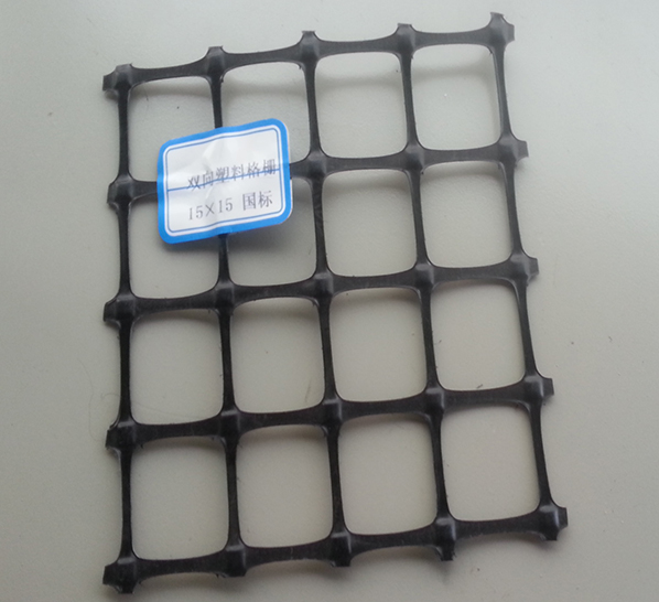 雙向拉伸塑料土工格柵是以聚丙烯(PP)或聚乙烯(PE)為原料,經(jīng)塑化擠出板材、沖孔、加熱、縱向拉伸、橫向拉伸而成。該材料在縱向和橫向上都具有很大的拉伸強(qiáng)度,這種結(jié)構(gòu)在土壤中能夠提供一個(gè)更為有效的力的承擔(dān)和擴(kuò)散的理想連鎖系統(tǒng),適應(yīng)于大面積承載的地基補(bǔ)強(qiáng)。