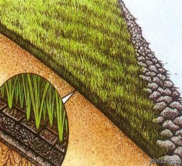 三維植被網(wǎng)是以熱塑性樹脂為原料,采用科學配方,經(jīng)擠出、拉伸等工序精制而成。它無腐蝕性,化學性穩(wěn)定,對大氣、土壤、微生物呈惰性。該產(chǎn)品底層為一個高模量基礎(chǔ)層,采用雙向拉伸技術(shù),其強度高,足以防止植被網(wǎng)變形,并能有效防止水土流失。表層為一個起泡層,膨松的網(wǎng)包以便填入土壤、種上草籽幫助固土,這種三維結(jié)構(gòu)能更好地與土壤相結(jié)合。在邊坡防護中使用三維植被能有效地保護坡面不受風、雨、洪水的侵蝕。該產(chǎn)品功能是有利于植被生長。隨著植被的形成,它的主要功能是幫助草根系統(tǒng)增強其抵抗自然水土流失能力。