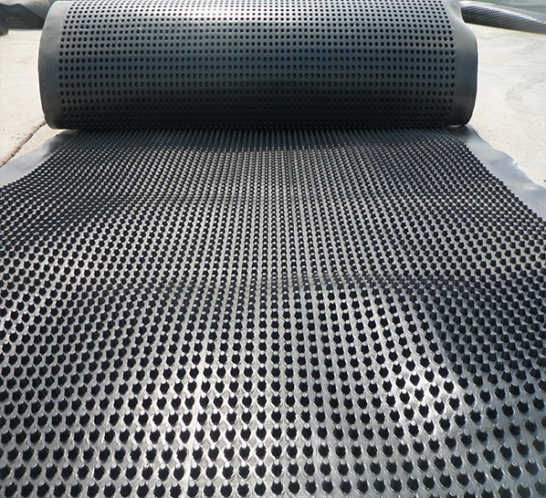 圓錐突臺的頂面膠接一層過濾土工布,以阻止泥土微粒通過,從而避免排水通道阻塞使孔道排水順暢。 傳統(tǒng)的排水方式使用磚石瓦塊作為導濾層、使用較多的鵝卵石或碎石作為濾水層、將水排到指定地點。而用排水板取代鵝卵石濾水層來排水則省時、省力又節(jié)能、節(jié)省投資、還能降低建筑物的荷載。