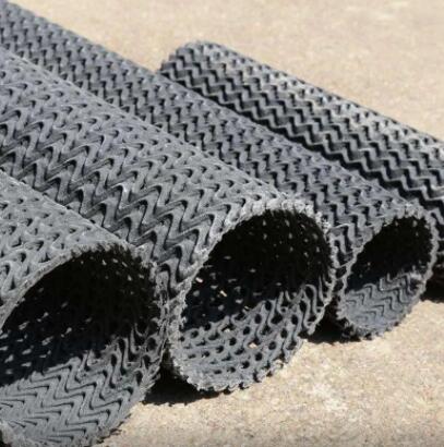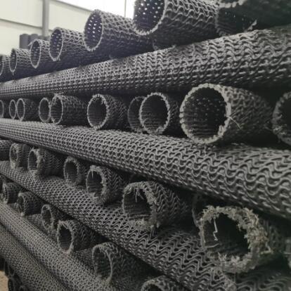 塑料盲溝材國際上稱為復合土工排水體Geocompositedreinagesystems(GDS),又稱三維排水板,土木工程用集排水暗渠材等。是將熱塑性合成樹脂加熱溶化后通過噴咀擠壓出纖維絲疊置在一起,并將其相接點熔結而成的三維立體多孔材料。